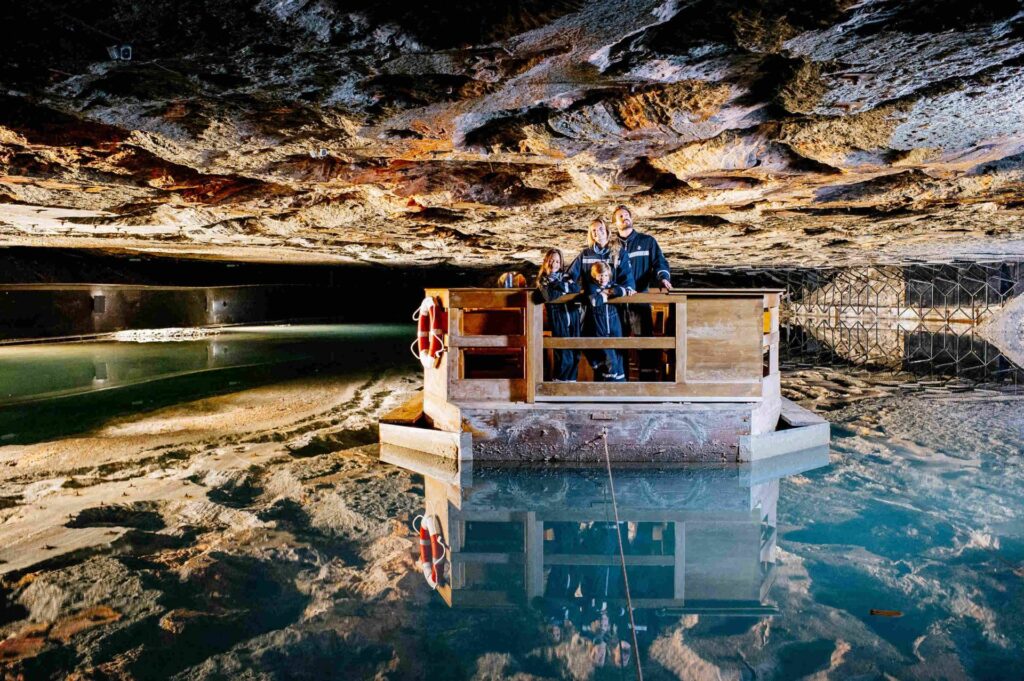 As the tour continued, we moved deeper into the mine, eventually reaching one of its most magical features: the underground salt lake. Hidden within a vast cavern, the lake’s surface reflected shimmering lights projected onto the rock walls. A short raft ride across the lake added a surreal, almost dreamlike quality to the experience.