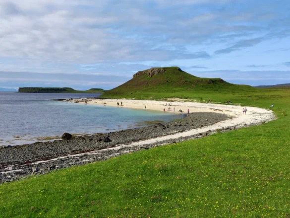 The beach itself is relatively small but striking in its simplicity. The expanse of white maerl curves gently along the shore, while rocky outcrops frame the edges. Behind the beach, grassy fields slope upward to moorland, with heather and gorse providing seasonal bursts of color. To the north, a small headland rises, offering panoramic views across Loch Dunvegan and the surrounding islands.