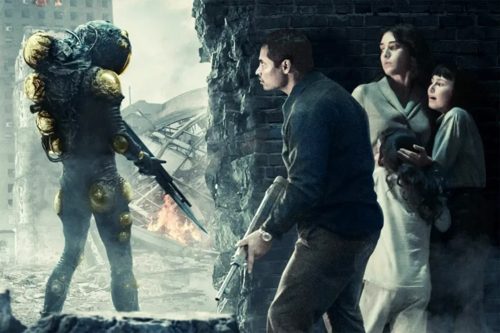 When an alien invasion suddenly begins, the film seems to confirm Peter’s fears. Massive ships descend, strange armored beings attack cities, and humanity is thrust into chaos. Peter’s visions appear to have been premonitions, and he takes on the role of reluctant protector as he fights to keep his family alive.