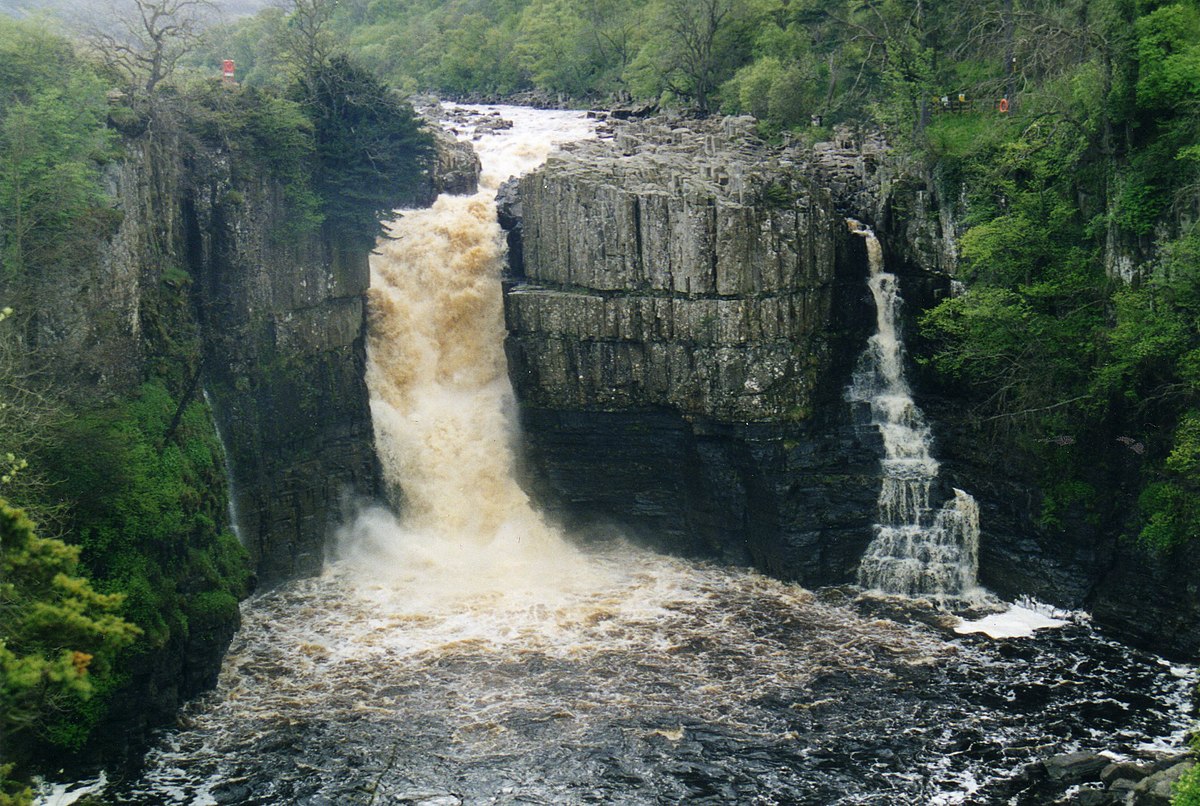 The River Tees, one of England’s major rivers, flows through the picturesque landscape of Upper Teesdale. High Force is situated on the upper reaches of the river, where the water tumbles over the Whin Sill, a layer of hard, resistant rock. The waterfall is particularly impressive because of its height and the dramatic setting in a deep gorge surrounded by limestone and heather-clad moorland.