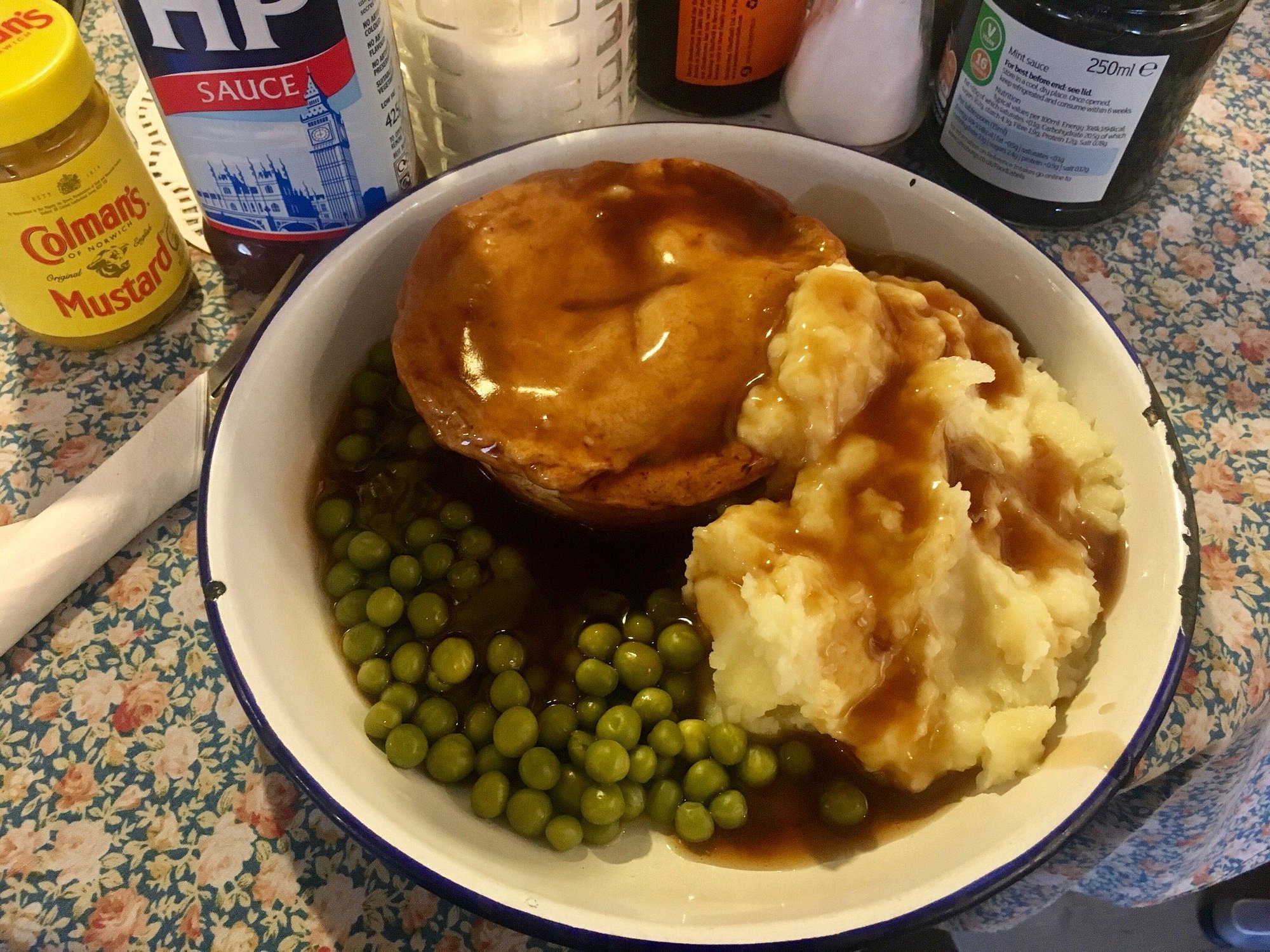 “Pie meals are served with real homemade mashed potatoes, Thick gravy and garden peas.”