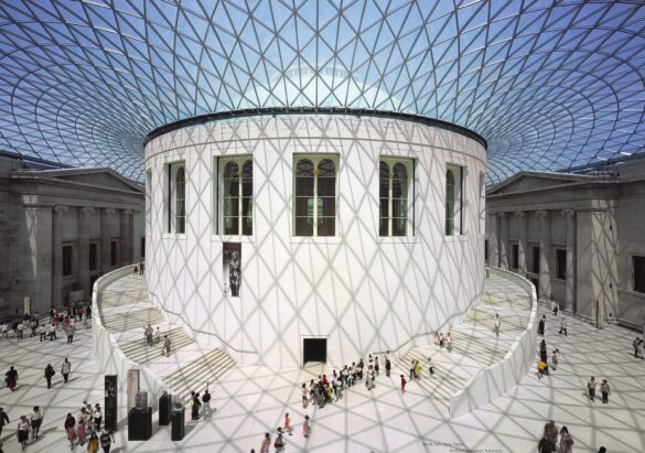 One of the museum’s most striking modern additions is the Queen Elizabeth II Great Court, designed by architect Sir Norman Foster and opened in 2000. This vast enclosed space surrounds the historic Reading Room, with a glass-and-steel roof that bathes the space in natural light. The Great Court revitalised the museum’s interior, creating an open and welcoming central hub for visitors.