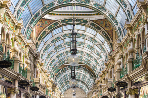 Walking through Victoria Quarter is akin to stepping into a living museum. The County Arcade features lavish interior decoration: marble columns, mosaic floors, Burmantofts faience tilework, mahogany shopfronts with curved glass, gilded lettering, and intricate ironwork. Domes are supported on pendentives decorated with allegorical mosaics representing Leeds’ industries, justice, commerce, and liberty.